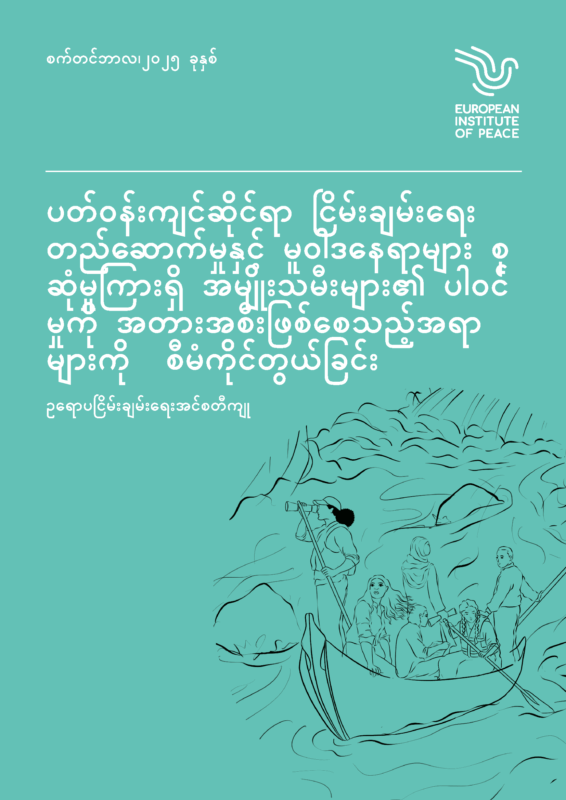 ဤနောက်ခံစာတမ်းသည် ဂျာမန်ဖက်ဒရယ်နိုင်ငံခြားရေးရုံး၏အကူအညီဖြင့် ဥရောပငြိမ်းချမ်းရေးအင်စတီကျုမှ ဦးဆောင်သော အတားအဆီးများကို ကျော်လွှားခြင်းနှင့် ငြိမ်းချမ်းရေးဖော်ဆောင်ရေး(Breaking Barriers, Making Peace) စီမံကိန်း ၏ တစ်စိတ်တစ်ပိုင်းဖြစ်သည်။ မြန်မာနိုင်ငံရှိ ဂျဲန်ဒါရေးရာ နှင့် ပဋိပက္ခများ၏ ဆက်စပ်နေသည့်ဆုံရပ်ဖြစ်တည်မှုကို အဓိကထား၍  ငြိမ်းချမ်းရေးတည်ဆောက်မှုနှင့် သဘာဝပတ်ဝန်းကျင်ဆိုင်ရာ တုံ့ပြန်ရေး ကြိုးပမ်းမှုများတွင် အမျိုးသမီးများ ဦးဆောင်နေသည့် အခန်းကဏ္ဍနှင့် ထိရောက်စွာပါဝင်ပုံကို ဆန်းစစ်သည်။ တွေ့ရှိချက်များသည် အမျိုးသမီးများ၏ ပူးပေါင်းပါဝင်မှု ကို အဟန့်အတား ဖြစ်စေသော အတားအဆီးများကို မီးမောင်းထိုးပြထားပြီး ပဋိပက္ခ ကာကွယ်ရေးနှင့် ငြိမ်းချမ်းရေး လုပ်ငန်းစဉ်များတွင် ၎င်းတို့၏ အခန်းကဏ္ဍကို မြှင့်တင်ရန် ခိုင်မာသော လုပ်ဆောင်ချက်များကို ချမှတ်ထားသည်။ ဤမှရရှိလာသည့် အသိအမြင်များသည် အမျိုးသမီးများ၊ ငြိမ်းချမ်းရေးနှင့် လုံခြုံရေး (WPS) အစီအစဉ်ကို ကမ္ဘာတစ်ဝှမ်းတွင် တိုးတက်စေရန် ရည်ရွယ်သည့် “ရှိရင်းစွဲအခြေအနေလား သို့မဟုတ် ဆီလျော်အောင်ပြုပြင်ဖို့ ရဲရင့်တဲ့လုပ်ဆောင်ချက်လား။ ။ အမျိုးသမီးများ၊ ငြိမ်းချမ်းရေးနှင့် လုံခြုံရေးအစီအစဥ်ကို ပြန်လည်ဖော်ဆောင်ခြင်း” တွင် မူဝါဒချမှတ်သူများနှင့် လက်တွေ့လုပ်ဆောင်သူများကို သက်သေအထောက်အထားအခြေပြု အကြံပြုချက်များဖြင့် သဘာဝပတ်ဝန်းကျင်ဆိုင်ရာ ငြိမ်းချမ်းရေးတည်ဆောက်မှုကဲ့သို့သော ဖွံ့ဖြိုးပြောင်းလဲလာနေသည့် နယ်ပယ်များတွင် အမျိုးသမီးများ၏  ထိရောက်စွာပါဝင်မှုကို မြှင့်တင်နိုင်မည့်အကြောင်းအရားများကို ပံ့ပိုးပေးပါသည်။
