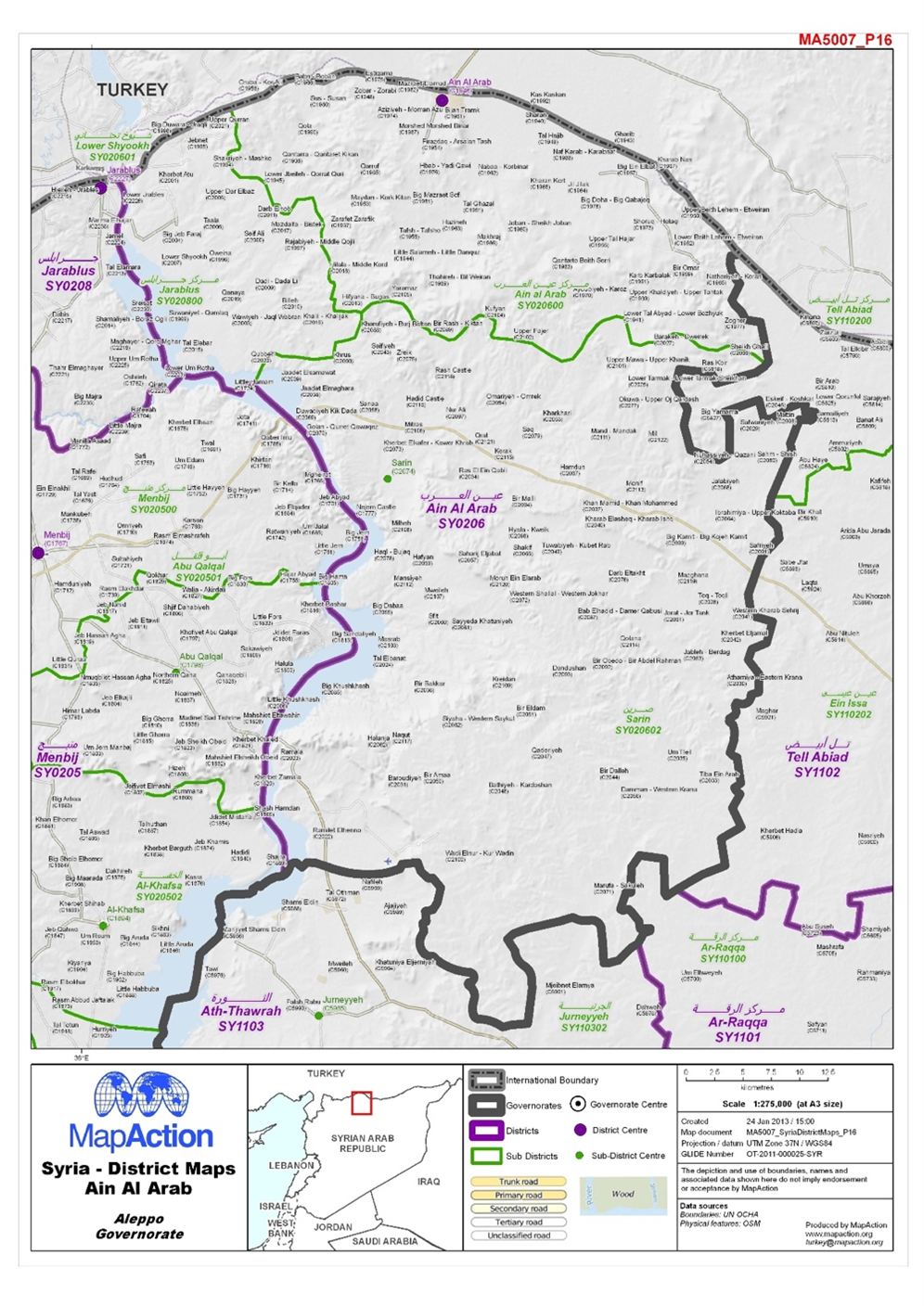 [3] Map Action, ‘Syria District Maps: Ain al-Arab’ (4 July 2016) <https://maps.mapaction.org/dataset/217-2791/resource/445fbacd-87c3-4ce8-9a99-98531eb22dfe> accessed 15 August 2023.