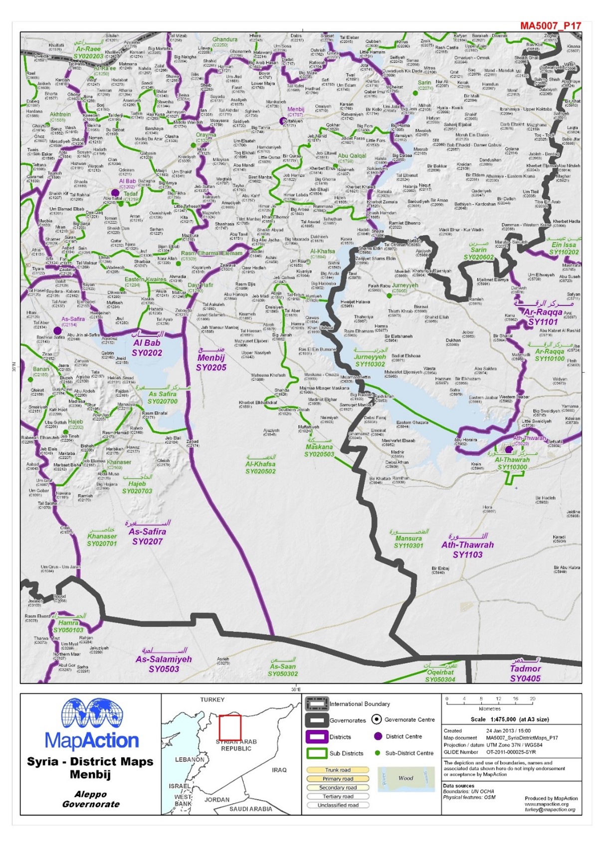[5] Map Action, ‘Syria District Maps: Menbij’ (4 July 2016) <https://maps.mapaction.org/dataset/217-2790/resource/11cb9a20-63d1-448f-9a4e-21ec63379781> accessed 17 August 2023.